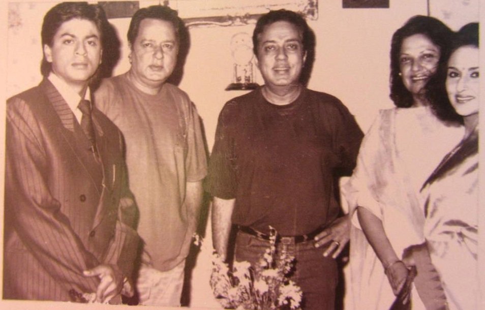 صوره لشاروخ خان مع نافين وبرافين نيشول وأنجو ماهيندرو أثناء خلال تصوير فيلم English Babu Desi Mem عام 1996