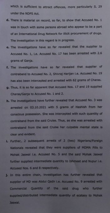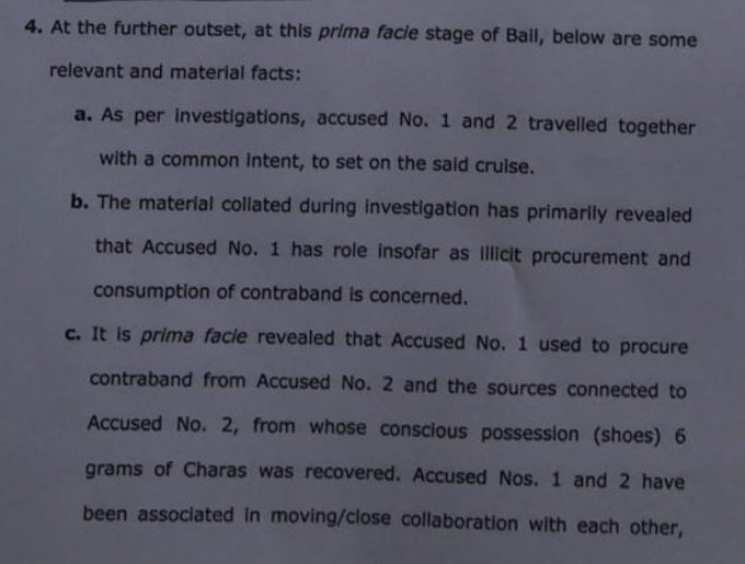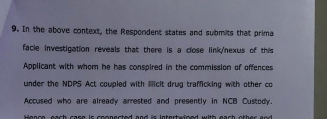 * تتم الان متابعة ردود طلب الكفالة من ال NCB - كشفت المواد التي تم جمعها أثناء التحقيق في المقام الأول أن آريان خان (A1) له دور فيما يتعلق بالمشتريات غير المشروعة وتوزيع المواد المهربة. - لقد تم الكشف منذ البداية أن A1 (آريان خان) كان يستخدم في شراء البضائع المهربة من A2 (ارباز ميرشانت ) ، المصادر متصلة بـ ارباز الذي تم العثور على 6 جرام من الكاراس في حيازته . - ارتبط A1 (آريان) و 2 (أرباز) بالتحرك / التعاون الوثيق وهو ما يكفي لإثبات الجرائم ، لا سيما القسم 29 (المؤامرة). - يشير إلى أمر الإفراج بكفالة عن ريا تشاكرابورتي من المفوض السامي: جميع جرائم المواد الخطرة والضارة والمتحركة غير متاحة بكفالة. - وذكر ال NCB في رده أن المواد التي تم جمعها أثناء التحقيق كشفت في المقام الأول أن خان لعب دورًا فيما يتعلق بالمشتريات غير المشروعة وتوزيع المواد المهربة. - NCB إلى محكمة مومباي : هناك مواد مسجلة تظهر أن خان كان على اتصال ببعض الأشخاص في الخارج الذين يبدو أنهم جزء من شبكة مخدرات دولية لشراء المخدرات بشكل غير مشروع. التحقيق لا يزال جاريا NCB: ارتبط خان وميرشانت بتعاون وثيق مع بعضهما البعض وهو ما يكفي لجذب الجرائم بموجب المادة 29 من قانون المواد الخطرة والضارة. من الواضح حتى الآن أن آشيت وهاريجان قد زودا خان وميرشانت . NCB : يكشف التحقيق أن جميع الأشخاص يشكلون جزءًا من سلسلة أكبر ولا يمكن استبعاد تورطهم في التآمر وارتكاب أعمال غير قانونية. NCB: في نفس السجل التجاري ، كانت هناك عدة عمليات ضبط بكميات وسيطة من المتهمين الآخرين ؛ كما تم ضبط كمية تجارية من ميفيدرون من أحد المتهمين. وبالتالي ، لا يمكن النظر في أحد هؤلاء المتقدمين بمعزل عن غيرهم. NCB: كل هؤلاء الأشخاص هم جزء لا يتجزأ من خيط مشترك لا يمكن فصله أو تشريحه عن بعضه البعض. في مثل هذه الحالة ، يصبح مقدار الاسترداد من الفرد غير منطقي. - NCB : جميع مكونات الجريمة من إعداد وقصد ومحاولة وارتكاب موجودة لهذا مقدم الطلب. ادعاء التضمين الكاذب غير صحيح ومضلل حيث توجد مادة كافية على شكل محادثات واتس اب وصور وما إلى ذلك. -NCB: نظرة عارية للسجلات تكشف بوضوح أن خان وميرشانت قد تم القبض عليهما عند بوابة الرحلات البحرية الدولية في مومباي. لذا يصبح التحقيق أمرًا ضروريًا بشأن كيفية دخول المتهم الرحلة البحرية بدون بطاقة إمبراطورة إم في الكلاسيكية. ^ تهمة جديده كيف دخل بدون بطاقة ركوب NCB : مجرد التكهنات بأن الحد الأقصى للعقوبة ضد هذا المتقدم هو عام واحد يستند فقط إلى التخمينات والتخمينات عندما يكون لدى البنك الأهلي التجاري مادة كافية لإظهار مكونات المؤامرة. NCB: سيتم تحديد أهمية لقطات CCTV في وقت المحاكمة وليس في هذه المرحلة الأولية عندما يكون التحقيق في المرحلة الأولية ومستمرًا ويشكل جزءًا من مواد التحقيق. مثل هذا الطلب من شأنه أن يسبب ضررا كبيرا للتحقيق الجاري. - في نفس السجل التجاري ، كانت هناك عدة عمليات ضبط كمية وسيطة (مخدرات) من المتهمين الآخرين. كما تم ضبط كمية تجارية من ميفيدرون من أحد المتهمين (أبو الشيخ). - لا يمكن اعتبار مقدم الطلب بمعزل عن غيره. كل هؤلاء الأشخاص هم جزء لا يتجزأ من خيط مشترك لا يمكن فصله أو تشريحه عن بعضهما البعض. في مثل هذه الحالة ، يصبح مقدار الاسترداد من الفرد غير منطقي. - يذكر NCB أن التحقيق الظاهر يكشف عن علاقة وثيقة ... تآمر معه في ارتكاب جرائم بموجب قانون NDPS إلى جانب الاتجار غير المشروع بالمخدرات مع متهمين آخرين تم القبض عليهم بالفعل وحالياً في عهدة NCB . - يذكر NCB أن ادعاء التضمين الكاذب غير صحيح ومضلل ... هناك مواد كافية في شكل محادثات whatsapp والصور وما إلى ذلك لإثبات أن مقدم الطلب كان جزءًا نشطًا من سلسلة المخدرات غير المشروعة مع المتهمين الآخرين. - إن مجرد التكهنات بأن الحد الأقصى للعقوبة ضد مقدم الطلب هو عام واحد يستند فقط إلى التخمينات والتخمينات عندما يكون لدى البنك الأهلي التجاري مادة كافية لإظهار مكونات المؤامرة. - NCB إلى محكمة مومباي: بالنظر إلى التأثير 