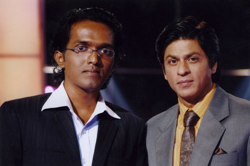 شاروخ خان مع احد المشتركين في موقع تصوير برنامج KBC خلال فترة تقديمه للبرنامج عام 2007 ( الموسم الثالث )
