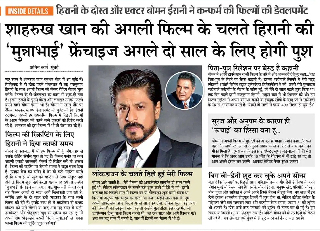 بدأت جلست القراءة لفيلم " راجكومار هيراني " في اخر مقابلة لبومان ايراني أكد تعاون شاروخ خان مع راجكومار هيراني وانه سيكون جزء من المشروع وقال خلال المقابلة :" شاروخ خان وراجكومار هيراني بدئوا جلسة القراءة .. ونعم أنا سأعمل في هذا المشروع. " من المعروف ان هيراني استغرق الكثير من الوقت للعمل على النص وسيبدأ الان العمل في مرحلة ما قبل الإنتاج. https://pbs.twimg.com/media/FKBeOmpa...pg&name=medium |