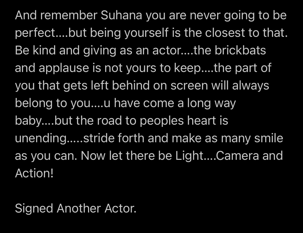 وكتب : " من استئجار ملخصات Archie الأدبية مقابل 25 جنيهًا يوميًا من متاجر تأجير الكتب إلى رؤية زويا اختر تجعل هذا حيا على الشاشة ... إنه أمر لا يصدق. أتمنى لجميع الصغار التوفيق وهم يخطون خطواتهم الصغيرة الأولى نحو أجمل المهن. " https://twitter.com/iamsrk/status/1525400426971275264 ونزل صوره لطاقم الفيلم مع رسالة موجهه لسوهانا خان كتب فيها : " وتذكري يا سوهانا خان ، لن تكوني مثاليه أبدًا ... ولكن اقرب ما يمكن ان تكوني الى ذلك هو ان تكوني على طبيعتك . كوني لطيفه ومعطائه كممثلة …. لا يمكنك الاحتفاظ بالعصا والتصفيق ... الجزء الذي يُترك وراءك على الشاشة سيكون دائمًا ملكًا لك ... لقد قطعنا شوطًا طويلاً يا حبيبتي ... ولكن الطريق إلى قلب الناس لا ينتهي… .. تقدمي للأمام وارسمي أكبر عدد ممكن من الابتسامات. الآن يجب أن يكون هناك ضوء…. الكاميرا والعمل! توقيع ممثل آخر. " https://pbs.twimg.com/media/FStPuNda...jpg&name=large https://pbs.twimg.com/media/FStPuNUa...pg&name=medium ^ In a peak Emotional State https://www.b44u.net/images/smilies/2013/_(16).gifhttps://www.b44u.net/images/smilies/2013/_(16).gif |