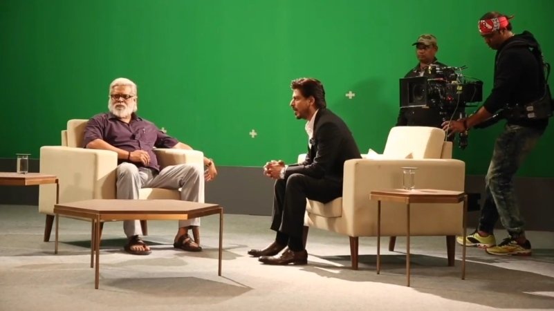 شاروخ خان مع العالم " نامبي نارايانان " ، ار مادهافان ، رانبير كابور ، كارن جوهر و ايان موخيرجي في موقع تصوير فيلم Rocketry The Nambi Effect