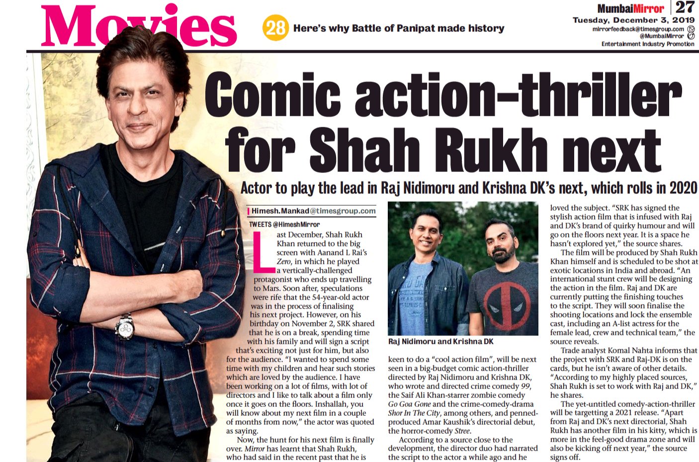 اخبار ( شبه مؤكد) : كوميديا أكشن إثاره لشاروخ خان، شاروخ سيوقع على مشروع راج نيديمورو و كريشنا المقبل، الذي سيكون ذو ميزانية الكبيرة، وسيبدأ تصويره في العام المقبل. تشير تقارير مومباي ميرور أن شاروخ خان الذي قال في الماضي القريب إنه حريص على إنتاج "فيلم اكشن " ، سيتم مشاهدته في فيلم كوميدي اكشن إثارة ضخم من إخراج راج نديمورو وكريشنا دي كيه ، الذي كتبوا وأخرجوا فيلم الجريمة الكوميدية 99 لسيف علي خان وفيلم Go Goa Gone ودراما الجريمة Shor In The City . وفقا لمصدر مقرب من المشروع ، فقد قدم الثنائي المخرج السيناريو إلى الممثل. قال المصدر : "لقد وقع شاروخ خان على فيلم الحركة و الاثارة مع المخرج الثنائي Raj and DK وسوف يبدأ في التصوير العام المقبل. إنها مساحة لم يستكشفها بعد ". شاه روخ خان سينتج الفيلم ، ومن المقرر تصويره في أماكن غريبة في الهند وخارجها كشف المصدر : "سيقوم طاقم عمل دولي بتصميم حركات الاكشن في الفيلم. يضع Raj و DK حاليًا اللمسات الأخيرة على البرنامج النصي. وسيقومون قريباً بوضع اللمسات الأخيرة للتصوير والانتهاء من الممثلين بالكامل ، بما في ذلك ممثلة للبطولة النسائية والطاقم والفريق الفني ، " ابلغ المحلل التجاري كومال نهتا أن المشروع مع شاروخ خان و Raj-DK على البطاقات ، لكنه لا يعلم تفاصيل أخرى. قال كومال نهتا : "وفقًا لمصادري الرفيعة المستوى ، من المقرر أن يعمل شاه روخ مع راج و دي كي " فيلم الإثارة الكوميدي الذي لا يزال بلا عنوان سوف يصدر في 2021. يقول المصدر : "بصرف النظر عن فيلم الثنائي راج و دي كيه المقبل ، شاه روخ لديه فيلم آخر ،والذي سيكون فيلم دراما ، وسوف يبدأ أيضا العام المقبل " https://pbs.twimg.com/media/EK1CngJU...jpg&name=large ^كوميدي وميزانيه كبيره ! الله يستر على الاقل مالازم يكون اول فيلم بينزل لشاروخ من بين الافلام الي بيشتغل عليها |