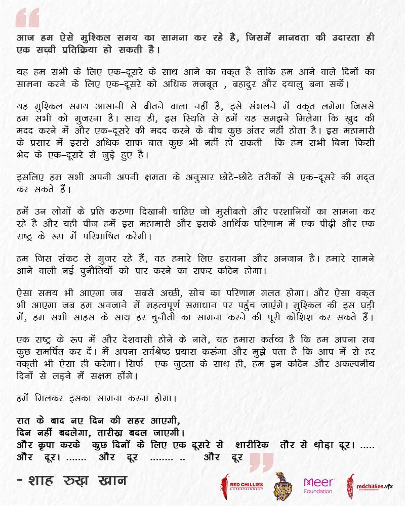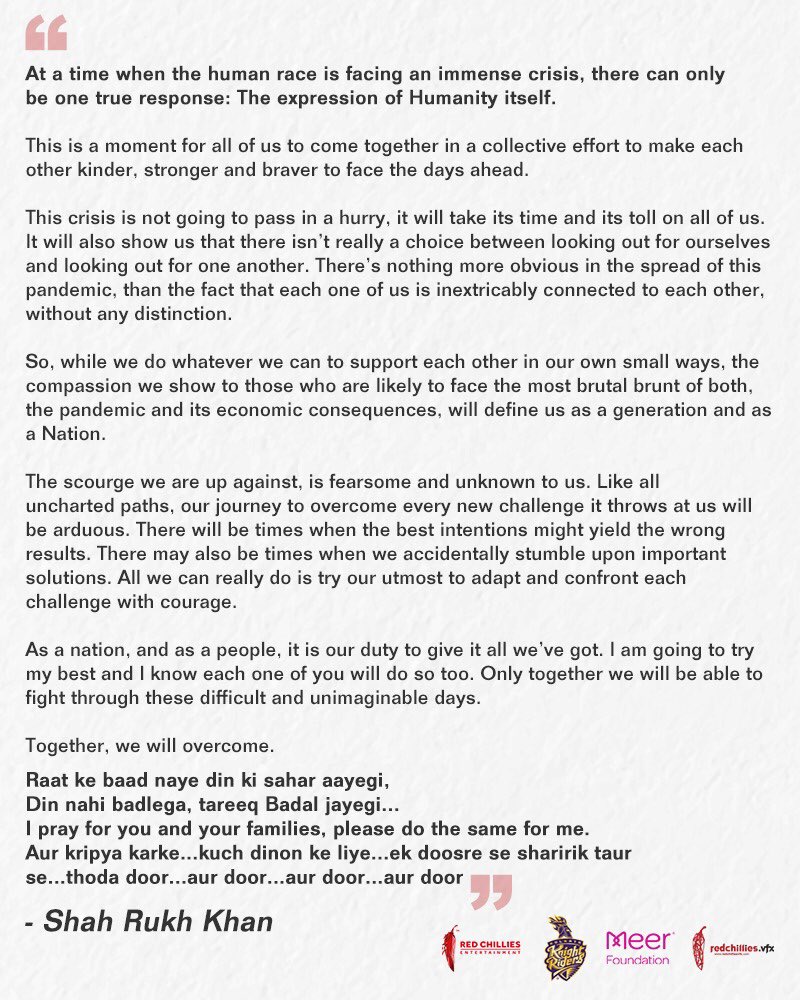 في ظل ازمة وباء فيروس كورونا وبعد قيام شاروخان بسلسلة من التبرعات هناك تبرع جديد من الكينج خان حيث توجهت هيئة البلدية المحلية في المدينة ، مؤسسة بلدية بريهان مومباي (BMC) ، إلى وسائل التواصل الاجتماعي لتوجيه الشكر للزوجين شاروخان وغوري على مساعدتهما. فقد تبرع شاروخان بمكتبه الخاص لتحويله الي حجر صحي وقد كتبت الهيئة المحلية على حسابها "نشكر شاروخان وغوري خان على تقديم مساحة مكتبية شخصية من 4 طوابق للمساعدة في توسيع سعة الحجر الصحي لدينا والمجهزة بالأساسيات للأطفال والنساء والمسنين في الحجر الصحي. في الواقع لفتة مدروسة وفي الوقت المناسب" رد شاروخان " عندما نقول الهيئة المحلية ، فعندئذٍ نشعر بإحساس بالملكية والفخر في كل ما تبذلونه من جهود ، يتم وضع فريقكم لمحاربة فيروس كورونا. كلانا ممتن لأننا يمكن أن نكون جزءًا من جهودكم لمساعدة ورعاية اهل مومباي " ******************** بالاضافة الي أنه سيتم إنشاء مطبخ لإرسال 2000 وجبة مطبوخة طازجة كل يوم لمساعدة الأسر والمستشفيات. بالاضافة الى تقديم متطلبات الطعام اليومية لأكثر من 5500 عائلة في مومباي وقد غردت مؤسسة Ek Saath Foundation " نحن في Ek Saath ممتنون للغاية لشاروخان ومؤسسته الخيرية مير لسخائهم ودعمهم الهائل. سنلبي حاجة ملحة لتزويد 5500 عائلة من العمال بأجر يومي بما يكفي من الحصة الغذائية لمدة شهر في هذه الأوقات الصعبة. ورد الكينج خان " شكرا لكم على خدمتكم لهذه العائلات. دعونا نستمر في العمل الجيد ونغرس الثقة فيهم وفي أنفسنا أيضًا. سيكون هناك ضوء في نهاية هذا النفق. دعنا ننتقل معا. نحن سعداء بأننا نقدر على مساعدتكم " بالاضافة الى انضمامة لـ مؤسسة روتي لتقديم 30000 وجبة يوميا وغردت مؤسسة روتي " شكرا شاروخان لدعمك في إطعام الناس خلال ازمة فيروس COVID-19 رد الكينج " انتم جميعا تقومون بخدمة رائعة. نحن في مؤسسة مير سعداء أننا يمكن أن نقدم المساعدة " كما قدمت مؤسسة Meer Foundation دعمًا للضروريات الأساسية والبقالة للعاملين بأجر يومي الذين تم توقفهم عن العمل في دلهي وستساعد أيضًا 100 ناج من الهجوم الحمضي وقد كتب رئيس وزراء دلهي على حسابه " شكرا لك سيد شاروخان على كلماتك الرقيقة. إن مساهمتكم الكريمة سوف تمس العديد من الأرواح في هذه الساعة العصيبة " ورد شاروخان " سيدي ، لا داعي للشكر ، سنستمر في أن نكون إخوة وأخوات في دلهي. إن شاء الله ، سوف نتغلب على هذه الأزمة قريباً. المزيد من القوة لكم " وغردت رئيس وزراء البنغال قائلة " شكرًا لك شاروخان ستساعد مساهمتك في مساعدة الكثير من الأشخاص المنكوبين خلال هذه الأوقات الصعبة. ستستمر مثل هذه المنافع الإنسانية في إلهام الملايين في هذا البلد الذين ينظرون إليك كنموذج يحتذى به في الاحترام والتوقير." رد شاروخان " اختي ، العمل الانساني غير اناني من واجبي أن أمد يدي لأصبح أخًا. آمي كولكاتا ، أعتقد ... "لقد نمت وحلمت أن الحياة كانت فرحة. استيقظت ورأيت أن الحياة كانت خدمة. تصرفت واذا كانت الخدمة فرحة ". - رابيندراناث طاغور " وتعهد شاروخ خان ايضا بتقديم الدعم لصندوق رعاية رئيس الوزراء ناريندرا مودي وكذلك صندوق إغاثة سي إم (مهاراشترا). جاء هذا الاعلان عن تلك التبرعات ردا على بعض المهاجمين الذين اتهموا شاروخان بالخيانة وعدم الوقوف بجانب الشعب الهندي في تلك المحنة العصيبة وعدم اعلانه عن اي تبرعات مما اضطر الهيئات المتبرع لها بالاعلان عن تلك التبرعات وقد غرد الكينج منذ يومان عبر حسابة الشخصي قائلاً " في هذه الأوقات ، من المفروض أن تجعل الجميع من حولك يعملون بلا كلل من أجلك .. ليس لديك علاقة بهم ... ربما حتى غير معروفين لك ... ليشعروا أنهم ليسوا وحدهم . دعنا نتأكد من أننا جميعًا نقوم بواجبنا الصغير لرعاية بعضنا البعض. الهند وجميع الهنود عائلة واحدة.كن آمنا ، حافظ على صحتك ولا تنس الدعاء." * يعتبر شاروخان اكثر من قام بالتبرعات لتخطي ازمة فيروس كورونا في الهند * https://scontent.fdmm2-3.fna.fbcdn.n...a0&oe=5EAE85DF ^A5erA5barSRK ^ حتى في موضوع التبرعات بيطلعونه خائن ، يعني الواحد اذا تبرع ضروري ي