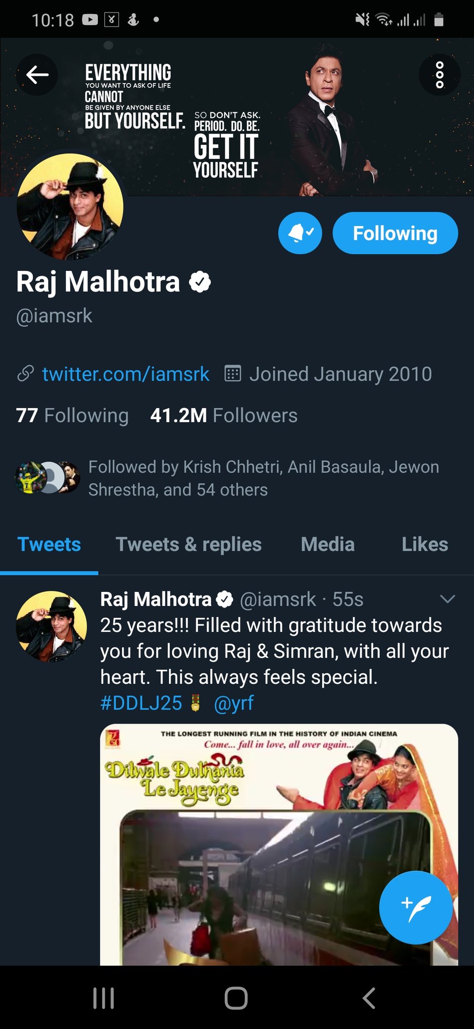 # شاروخ خان الان قام بتغيير صور ملفاته الشخصية على التويتر والانستقرام والفسيبوك وتغيير اسمه على التويتر الى ( Raj Malhotra ) احتفالا بمرور 25 عام على فيلم DDLJ https://pbs.twimg.com/profile_images...1u_400x400.jpg https://pbs.twimg.com/media/Ekvy9hPU...jpg&name=large س1 ++ كاجول قامت ايضا بتغيير صورة واسم حساباتها الى Simran https://pbs.twimg.com/media/Ekvy-BzV...jpg&name=large |