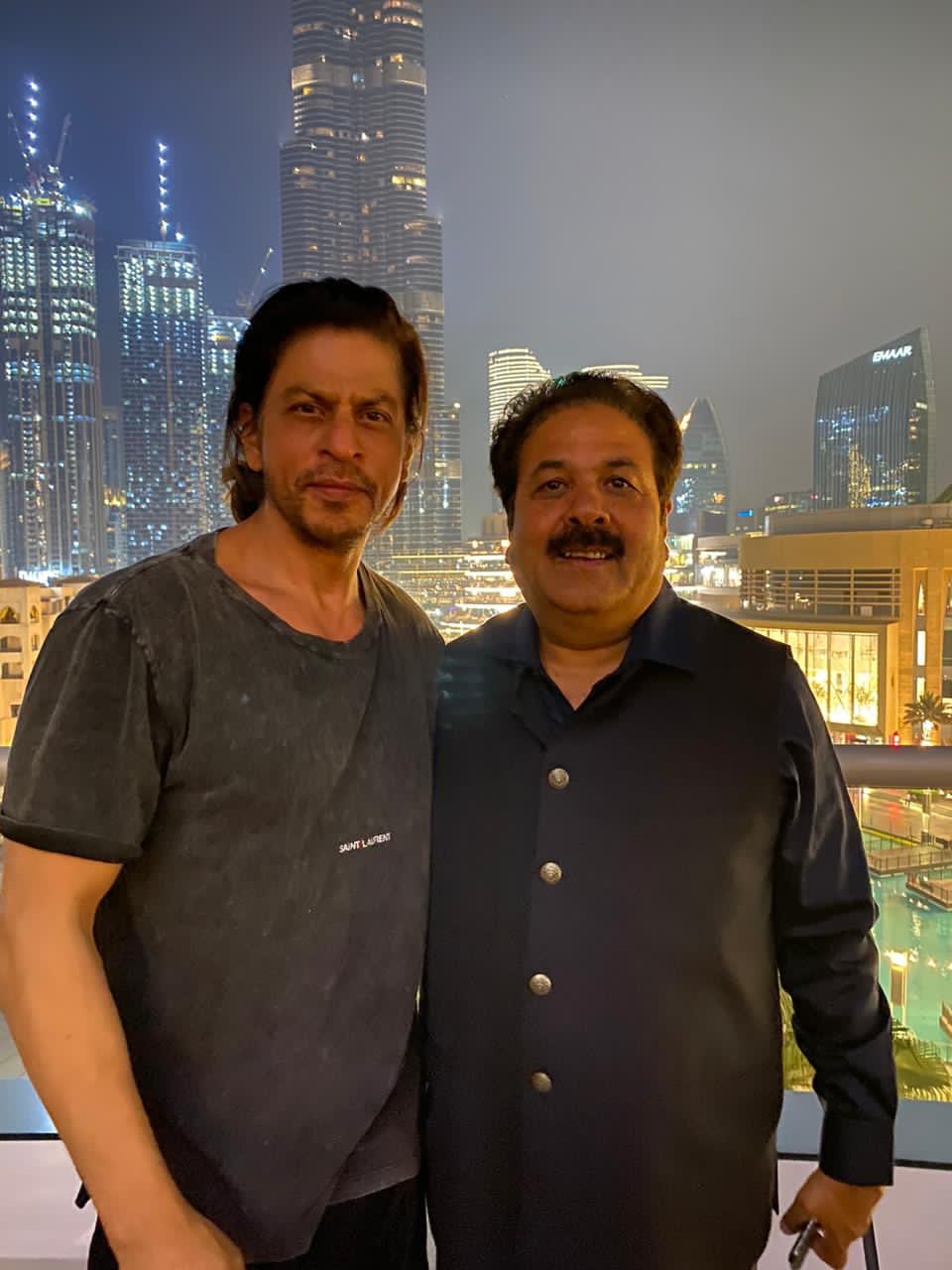 شاروخ خان مع راجيف شوكلا امس خلال الاحتفال بعيد ميلاده في برج خليفة في دبي