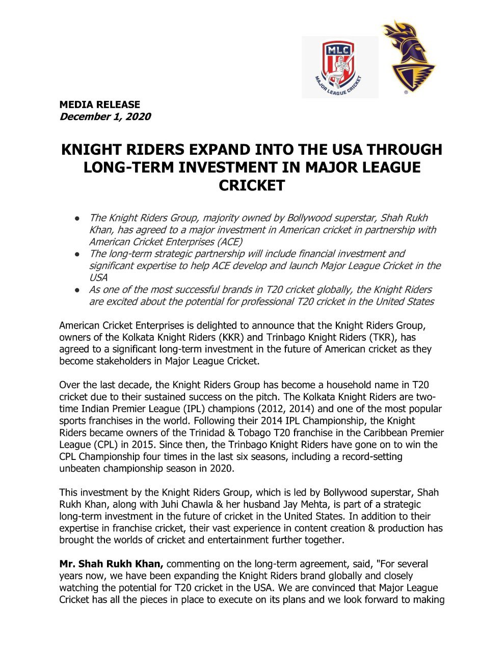 تويتر فينكي مايسور : " يسعدني الإعلان عن الشراكة الجديدة بين Knight Riders و American Cricket Enterprises في بطولة Major League Cricket ( دوري الكريكيت ) في الولايات المتحدة! نتطلع إلى عرض لعبة الكريكيت T20 في أمريكا! " https://pbs.twimg.com/media/EoIy4z0V...jpg&name=large https://pbs.twimg.com/media/EoIy4z0U...jpg&name=large https://twitter.com/VenkyMysore/stat...027905/photo/2 |