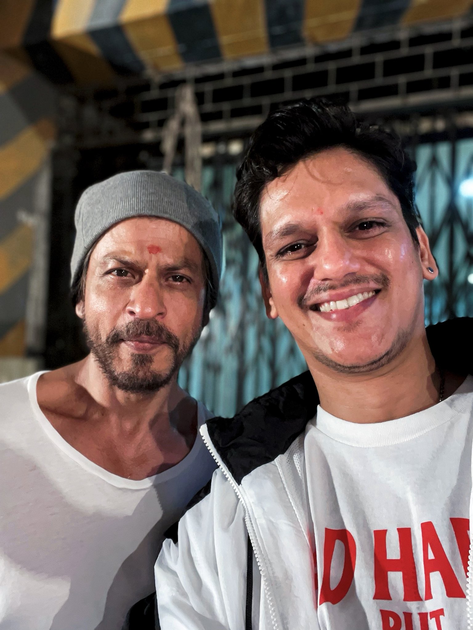 صوره لـ شاروخ خان مع الممثل فيجاي فارما في موقع تصوير فيلم Darling من انتاج RCE
