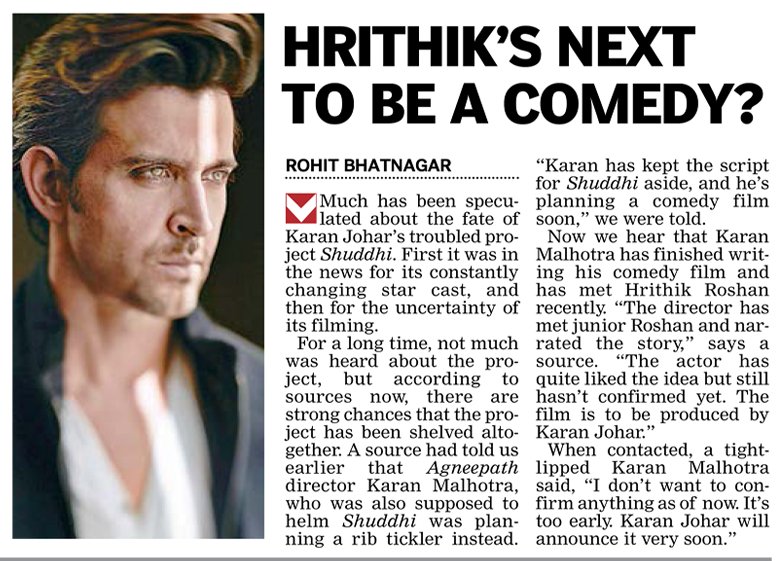 قبل بداية تصوير قابل، حجز ريتيك نفسه بغرفة بفندق و انعزل عن العالم الخارجي لمدة 4 أيام ليحضّر للدور  عن فيلم كاران مالهوتر...يقال أن الفيلم كوميدي و بعد الانتهاء من السيناريو عرضه على ريتيك و ريتيك أحب السيناريو لكنه لم يؤكد بعد....كاران يفترض أن ينتج الفيلم....عند الإتصال به، قال مالهوترا: " لا أريد تأكيد أي شيء في الوقت الحالي. إنه من المبكر جدا. كاران جوهر سيعلن عنه قريبا"   |