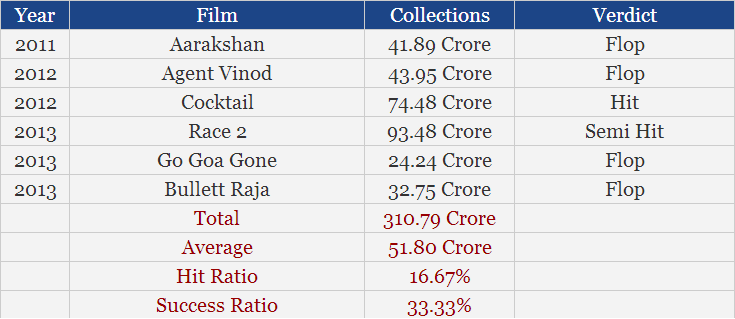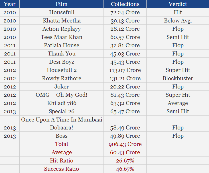 تحليلات : اعلى الاجماليات للاعوام من 2000 الى 2013 قمنا بتحديث افضل 5 لاعلى اجماليات من كل سنة منذ عام 2000 . يمكن القول ان العام الماضي كان الاكثر نجاحا لصناعة السينما , حيث ان متوسط اعلى 5 افلام اكثر من 200 كرور روبية - مرتفعة بنسبة 66% مقارنة بالعام الماضي 2012 . لا يزال شاروخان الممثل الاكثر نجاحا في العقدين الماضيين مع 16 من افلامه التي قد وجدت لها موضعا في اعلى الاجماليات في قائمة العام . يلي شاروخان اكشاي كومار الذي لم يتصدر قائمة اعلى الاجماليات من قبل , و لكنه كان ناجحا بشكل كبير مع 12 فلما في قائمة افضل 5 . لعب ريتيك دور البطولة في 19 فلما فقط في مسيرته و التي كانت منها 9 افلام قد حققت اجمالي ضخم . سلمان هو اعلى من ريتيك مع 11 فلما . و عامر في المركز 5 مع 7 افلام , فقط لانه مثل في 11 فلما في السنوات 14 ماضية . * عام 2000 *  Kaho Na Pyaar Hai اكشن \ رومناسي 38 Cr Mohabbatein دراما عائلية \ رومانسي 33.25 Cr Mission Kashmir دراما 22.25 Cr Josh دراما \ اكشن 20 Cr Refugee دراما 18.75 Cr المتوسط : 26.45 Cr * عام 2001 *  Gadarرومانسي \ اكشن 75.5 Cr Kabhi Khushi Kabhie Gham دراما عائلية 47 Cr Lagaan رياضي \ دراما تاريخية 29 Cr Indian اكشن 21 Cr Jodi No.1 كزميدي \ دراما عائلية 17.5 Cr المتوسط : 38 + 11.55 Cr من العام السابق * عام 2002 *  Devdas دراما \ رومانسي 32.5 Cr Raaz رعب 22 Cr Kaante اكشن \ دراما 19.5 Cr Aankhen اكشن \ دراما 15.25 Cr Humraaz اثارة 14.5 Cr المتوسط : 20.75 - 17.25 Cr * عام 2003 *  Koi Mil Gaya دراما اطفال عائلية - 42.5 Cr Kal Ho Na Ho رومانسي \ دراما عائلية 35 Cr The Hero اكشن \ اثارة 24.5 Cr Baghban دراما عائلية 22.5 Cr Munnabhai MBBS كوميدي \ دراما 21.25 Cr المتوسط : 29.15 + 8.4 Cr * عام 2004 *  Veer Zaara رومانس دراما 40 Cr Main Hoon Naa اكشن \ كوميدي \ دراما عائلية 33 Cr Mujhse Shaadi Karogi كوميدي 29.5 Cr Dhoom اكشن 29 Cr Khakee اكشن 25 Cr المتوسط : 31.3 + 2.15 Cr * عام 2005 *  No Entry كوميدي 43 Cr Bunty aur Babli كوميدي \ دراما 35.75 Cr Mangal Pandey دراما 28.25 Cr Garam Masala كوميدي 27 Cr Maine Pyaar Kyun Kiya كوميدي 27 Cr المتوسط : 32.2 + 0.9 Cr * عام 2006 *  Dhoom 2 اكشن 80.25 Cr Krrish اكشن \ رجل خارق 69.25 Cr Lage Raho Munnabhai كومدي \ دراما عائلية 71 Cr Fanaa رومانس \ اكشن 52 Cr Don اكشن 51 Cr المتوسط : 64.7 + 32.5 Cr * عام 2007 *  Om Shanti Om دراما عائلية \ كوميدي \ رومانس 79.42 Cr Welcome كوميدي 70.75 Cr Partner كوميدي 61.19 Cr Chak De India رياضي \ دراما 67.69 Cr Taare Zameen Par دراما عائلية 62.48 Cr المتوسط : 68.31 + 3.61 Cr * عام 2008 *  Ghajini اكشن 114.67 Cr Rab Ne Bana Di Jodi رومانس 86.78 Cr Singh Is Kinng كوميدي 68.48 Cr Race اثارة \ اكشن 61.68 Cr Jodhaa Akbar دراما تاريخية 59.03 Cr المتوسط : 78.13 + 9.82 Cr * عام 2009 *  3 Idiots دراما عائلية \ كوميدي 202.57 Cr Love Aaj Kal رومانسي 66.89 Cr Wanted اكشن 60.69 Cr Ajab Prem Ki Ghazab Kahani كوميدي \ رومانس 62.94 Cr De Dana Dan كوميدي 48.3 Cr المتوسط : 88.28 + 10.15 Cr * عام 2010 *  Dabangg اكشن \ كوميدي 140.1 Cr Golmaal 3 كوميدي 107.56 Cr Raajneeti اثارة \ دراما 92.93 Cr Housefull كوميدي 72.07 Cr My Name Is Khan دراما عائلية 72.74 Cr المتوسط : 97.08 + 8.8 Cr * عام 2011 *  Bodyguard كوميدي \ اكشن \ رومانس 141 Cr Ready كوميدي 121Cr Ra.One اكشن \ رجل خارق 115 Cr Don 2 اكشن 110 Cr Singham اكشن 99.5 Cr المتوسط : 117.2 + 20.12 Cr * عام 2012 *  Ek Tha Tiger اكشن \ رومانس 199 Cr Dabangg 2 اكشن \ كوميدي 155 Cr Rowdy Rathore اكشن \ كوميدي 132 Cr Agneepath اكشن \ دراما 120 Cr Jab Tak Hai Jaan رومانس 120 Cr المتوسط : 145.2 + 28 Cr * عام 2013 *  Dhoom 3 اكش 285 Cr Krrish 3 اكشن \ رجل خارق 245 Cr Chennai Express اكشن \ كوميدي \ رومانس 227 Cr Yeh Jawaani Hai Deewani رومانس \ دراما 188 Cr Ram Leela رومانس 111 Cr المتوسط : 211.2 + 66 Cr :اكثر الفئات نجاحا : * الدراما - 29 * الاكشن - 27 * الكوميديا - 27 * الرومانسية - 17 * الاثارة - 4 * الرجل الخارق - 3 * الرياضي - 2 * الرعب - 1 :اكثر الممثلين نجاحا : الارقام مأخوذة من قائمة افضل 5 المذكورة سابقا * شاروخان 16 - من اجمالي 26فلما منذ عام 2000 * أكشاي كومار 12 - من 56 فلم * سلمان خان 11 - من 35 فلم * ريتيك روشان 10 - من 19 فلم * عامر خان 7 - من 11 فلم * اجاي ديفيجان 5 - من 55 فلم * ابيهيشك باتشان 5 - من 41 فلم * سنجاي دوت 5 - من 51 فلم * سيف علي خان 3 - من 27 فلم * رانبير كابور 3 - من 11 فلم * اميتاب باتشان 3 افلام * ساني ديول 3 افلام المصدر ترجمة تــــآبو