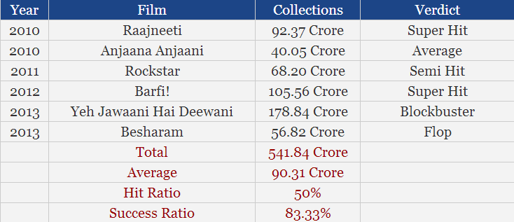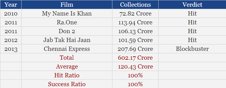 آداء ممثلين بوليود منذ عام 2010  1. شاروخان  المجموع الاجمالي : 602.17 كرور المتوسط : 120.43 كرور معدل الضربة : 100 % نسبة النجاح : 100 % 2. سلمان خان  المجموع الاجمالي : 898.82 كرور المتوسط : 128.40 كرور معدل الضربة : 85.71 % نسبة النجاح : 85.71 % 3. رانبير كابور  المجموع الاجمالي : 541.84 كرور المتوسط  90.31 كرور معدل الضربة  50 % نسبة النجاح : 83.33 % 4. عامر خان  المجموع الاجمالي : 365.88 كرور المتوسط : 121.96 كرور معدل الضربة : 33.33 % نسبة النجاح : 66.67 % 5. ريتيك روشان  المجموع الاجمالي : 465.67 كرور المتوسط : 93.134 كرور معدل الضربة : 60 % نسبة النجاح : 60 % 6. اجاي ديفيجان  المجموع الاجمالي : 764.19 كرور المتوسط : 58.78 كرور معدل الضربة : 46.15 % نسبة النجاح : 53.85 % 7. اكشاي كومار  المجموع الاجمالي : 906.43 كرور المتوسط : 60.43 كرور معدل الضربة : 26.67 % نسبة النجاح : 46 % 8. سيف على خان  المجموع الاجمالي : 310.79 كرور المتوسط : 51.80 كرور معدل الضربة : 16.67 % نسبة النجاح : 33.33 % المصدر .................................................. .......................... وعد شاروخان لــ فرح خان  اصيب شاروخان مؤخرا في 23 يناير خلال التصوير لفلم HNY و هرع به الى المستشفى . على الرغم من ان جميع من حوله يبدو انهم يزعمون بانه على ما يرام , الا ان المصادر كشفت ان لديه مشكلة جدية في الكتف و ضررا بالغا في الركبة . و قد عاد ألم ظهره ايضا الذي كان يعاني منه سابقا . و بالطبع , شاروخان هو شاروخان فهو دائما ما يقوم بالتقليل من الاصابات . اشكركم جميعا على اهتمامكم بحبي , شاروخ على ما يرام و عنيد لاستئناف التصوير ... لذلك عدنا جميعا للعمل . لقد كان الله كريما .  و قام طاقم العمل بأكمله بتحية البطل العائد بحفاوة .  اذا لدينا اجازة لمدة يومين , ليس انني لا استمتع بذلك ... تعافى بشكل جيد شاروخ .  لدرجة انه عازما بشدة على استضافة حفل توزيع جوائز زي سينما في 8 فبراير , و لكننا علمنا ان ابيهيشك باتشان و ريتيش ديشموخ من سيقوم بالاستضافة بدلا من ذلك . هذا ليس كل شئ , فقد وعد صديقته و مخرجة فلم HNY , فرح خان انه لن يقوم بتأخير الجدول الزمني لتصوير فلمهم . و بالمناسبة , شاروخ هو منتج الفلم ايضا . هذا هو المحترف الحقيقي , و لكن ربما ينبغي عليه ان يولي صحته اهتماما اكبر و ان يبطأ من الامور اذا تتطلب الامر . ما رأيك ؟ المصدر ترجمة تـــآبو