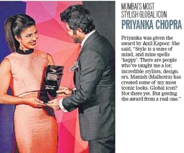 بعد فوزها بجائزتها الجديدة ، غردت بريانكا تشوبرا على حسابها بالتويتير قائة : شكرا لكم اتش كافيه على جائزة الممثلة العالم...ية الاكثر اناقة في مومباي ...امسية جميلة واجتماع مع العديد من الاصدقاء ...هذه الجائزة لك آمي باتيل