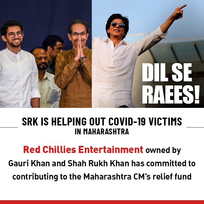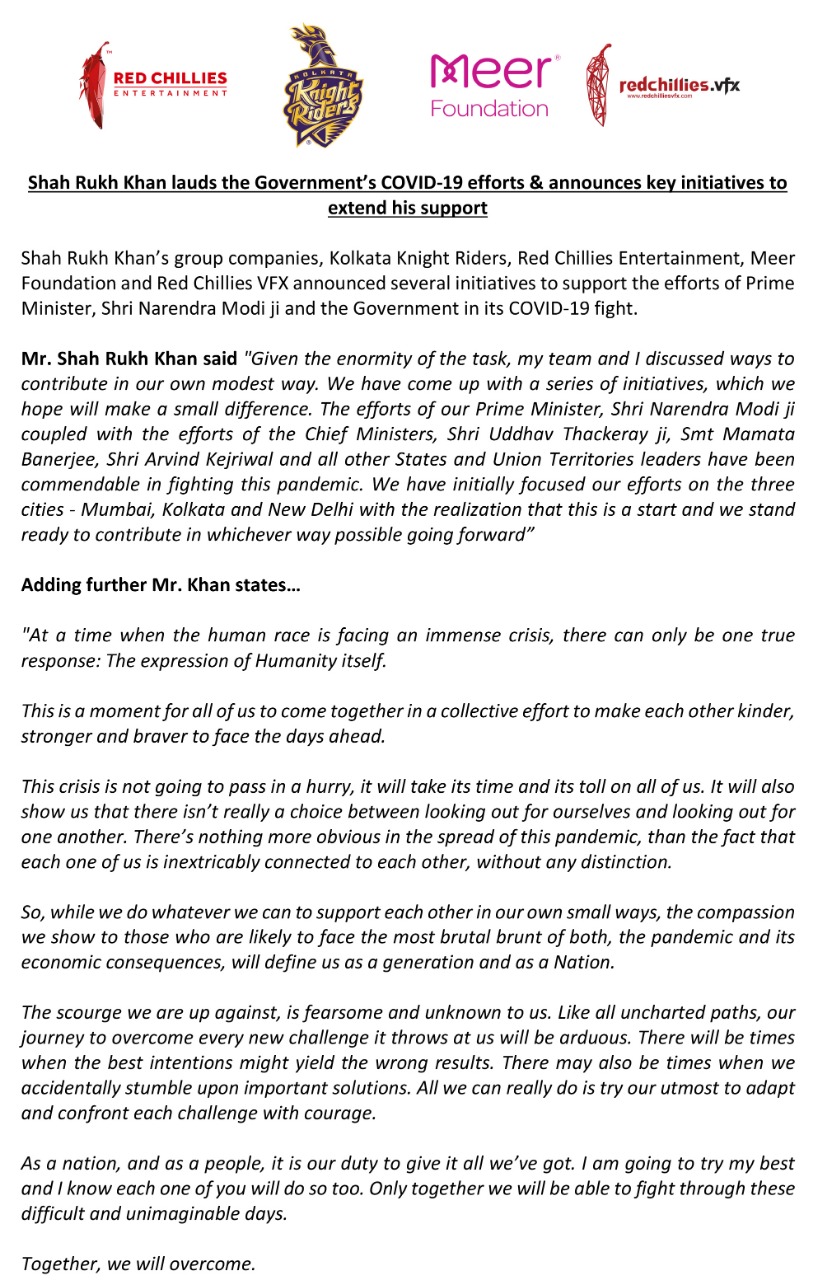 من الحساب الرسمي لشركة RedChilliesEnt عن مساهمات شاروخ خان من خلال مؤسسة Meer و فريق KKR و شركة RCE للتبرع لعدد من صناديق ومنظمات الاغاثة لمكافحة فايروس كورونا : " في حين أننا نبقى بأمان في المنزل ، يعمل العديد من أجل سلامتنا وإعالة أنفسهم. إليك مساهمتنا الصغيرة لضمان صحتهم ورفاههم! منفصلين ولكن معا ، سوف نتغلب! " https://twitter.com/RedChilliesEnt/s...14713041764352